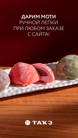Фишка нашего меню — по-настоящему большие порции роллов. Вы можете заказать половину набора двух разных роллов, чтобы попробовать как можно больше вариаций. Всего в меню представили более 50 видов суши, гунканов, авторских и классических роллов. Еще в ресторане «Такэ» мы нарезаем сашими, сами лепим гедза и те самые моти, делаем лапшу в воке и варим азиатские супы.