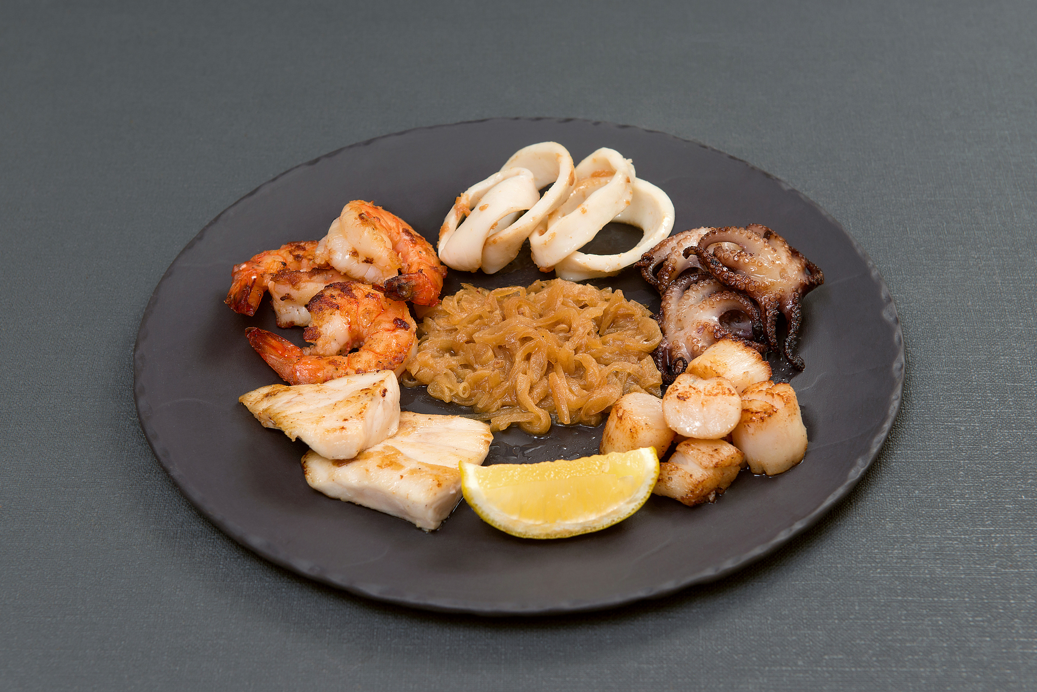 тигровая креветка, кальмар, осьминог, масляная  рыба,  морской гребешок, репчатый лук, лимон