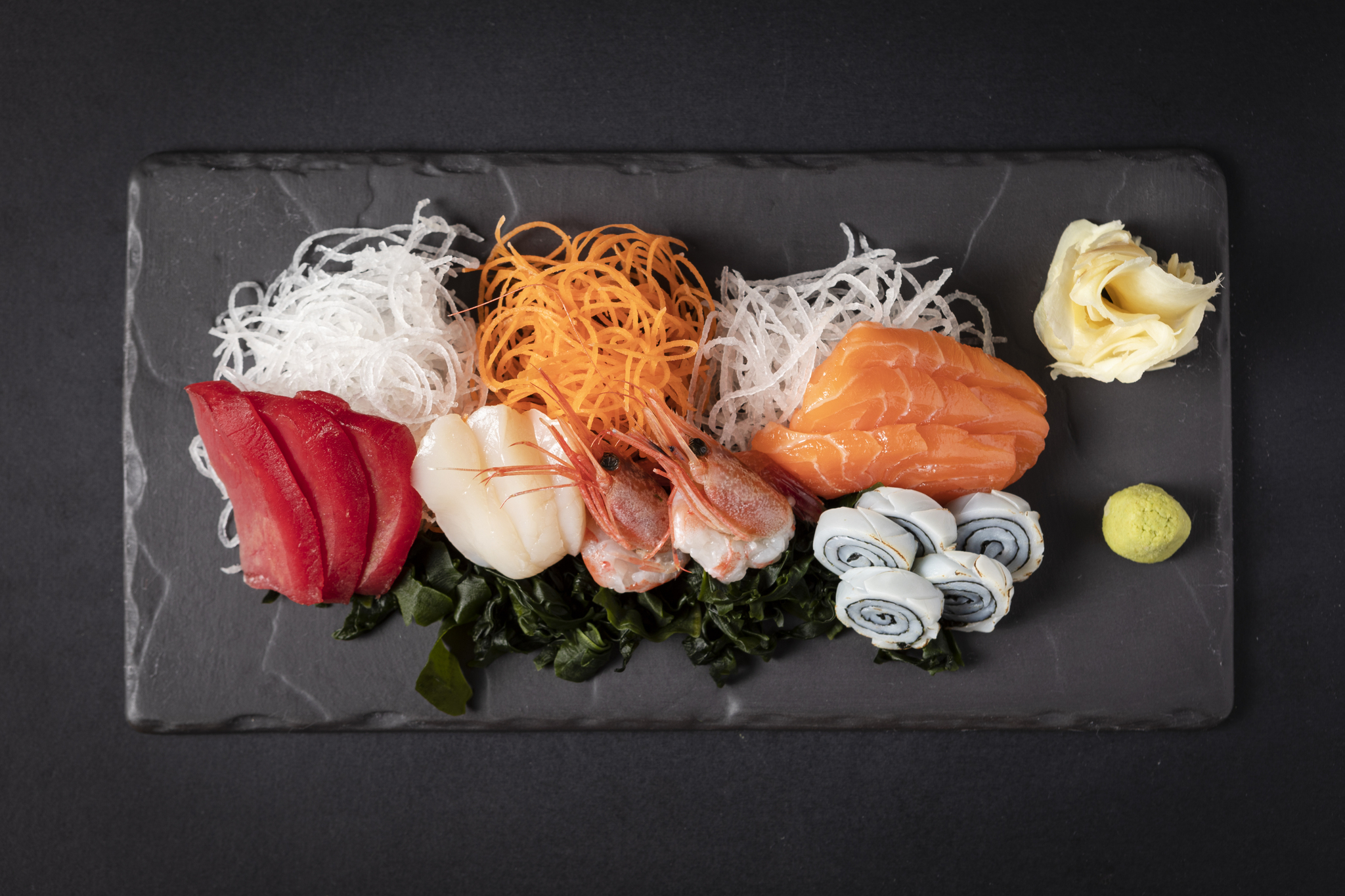 Сашими:лосось,гребешок,ама эби,кальмар,тунец.