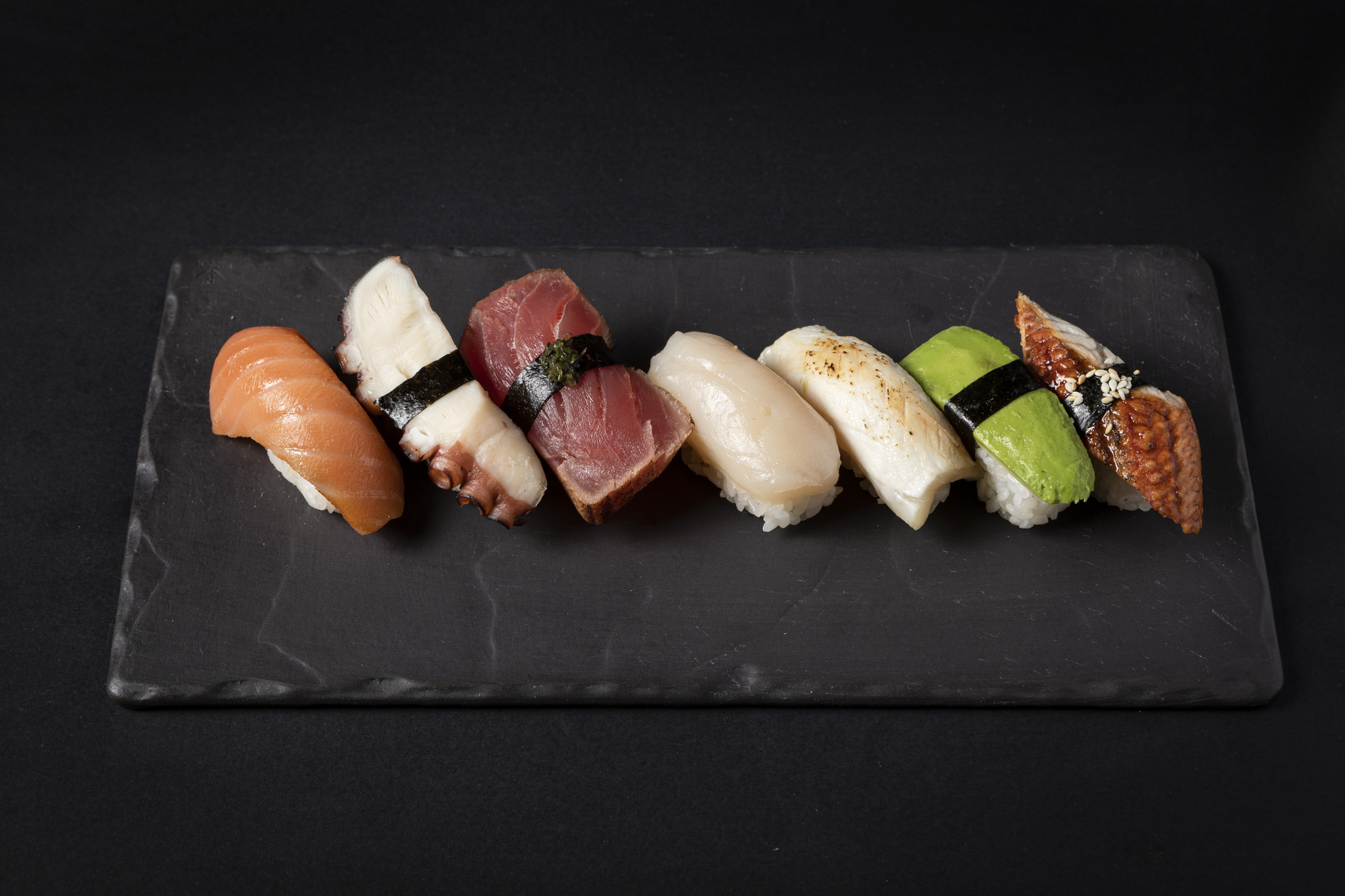 Суши по 1 шт :лосось,осьминог,тунец,гребешок,масляная рыба ,авокадо,угорь.