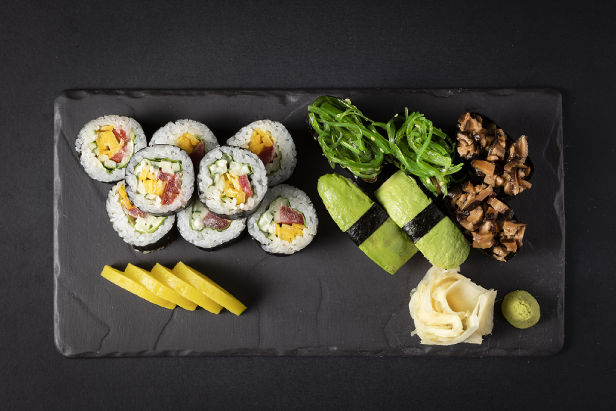 Ролл Ясай Маки,суши авокадо-2 шт, гункан Чука-2 шт, гункан шитаке-2 шт.