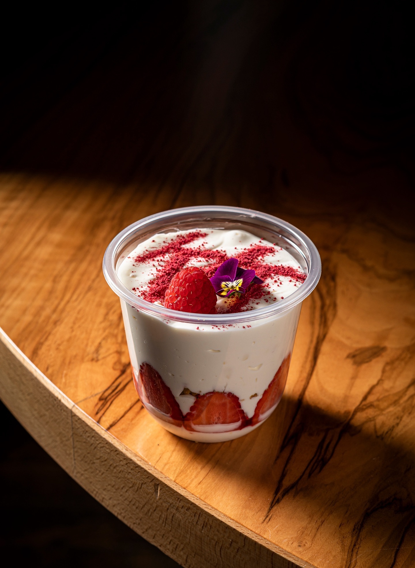 Творожный мусс ,свежая клубника,печенье ,грецкий орех, клубничное варенье.