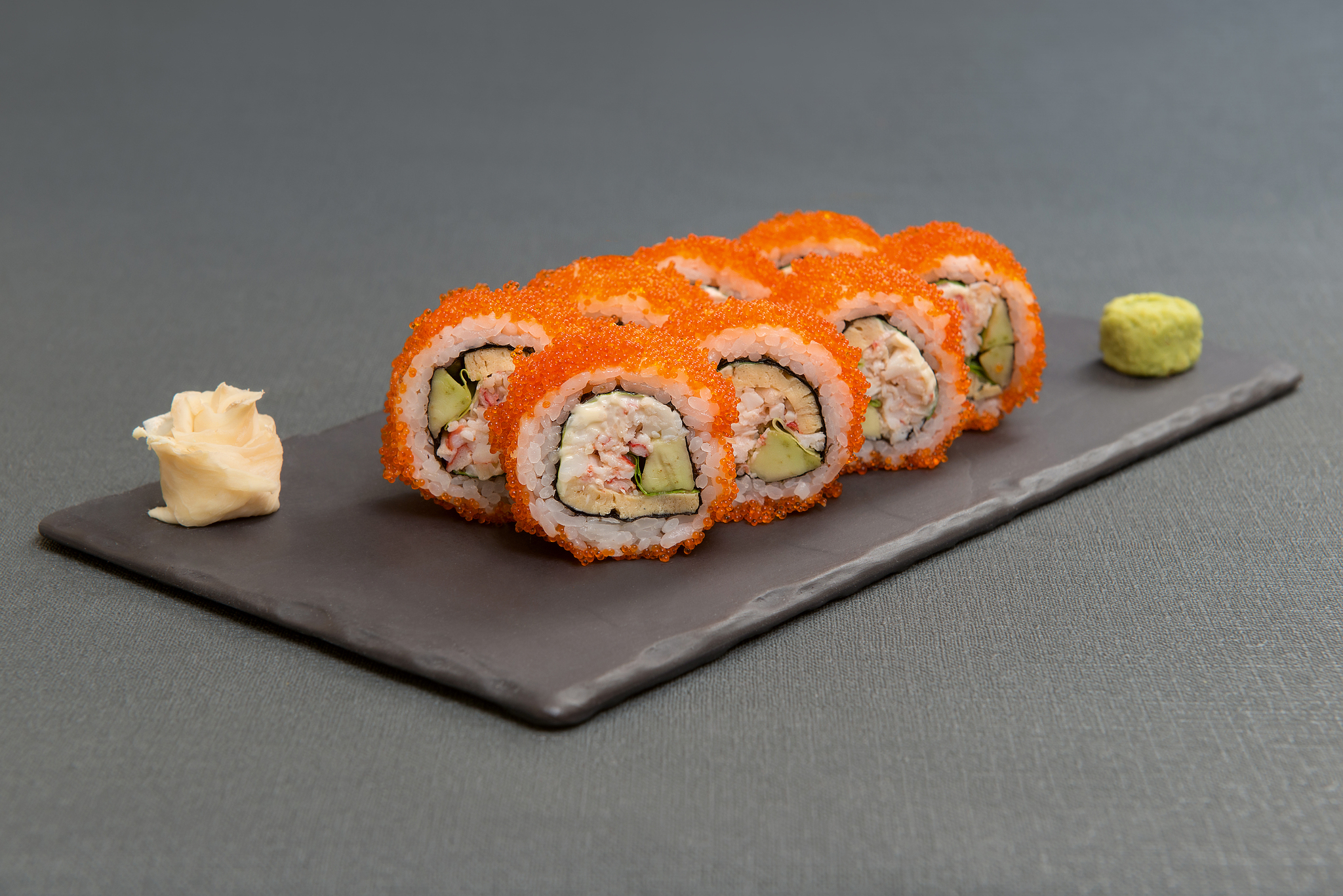 авокадо, креветка отварная, омлет, майонез, салат романо, икра тобико, рис отварной с заправкой, водоросли нори, имбирь, васаби, соевый соус.