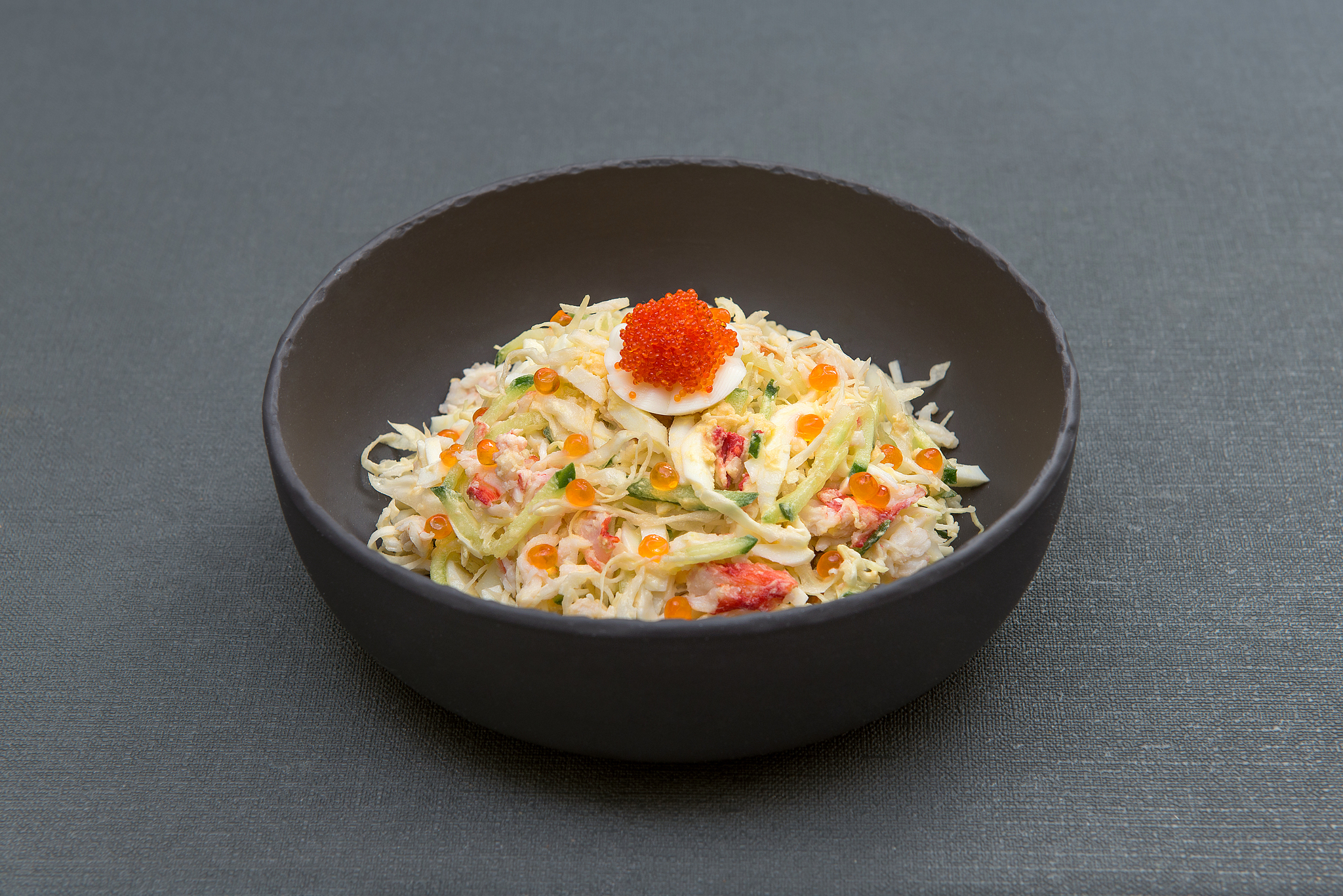 краб (мясо) отварной, белокочанная капуста, огурец, яйцо отварное, майонез