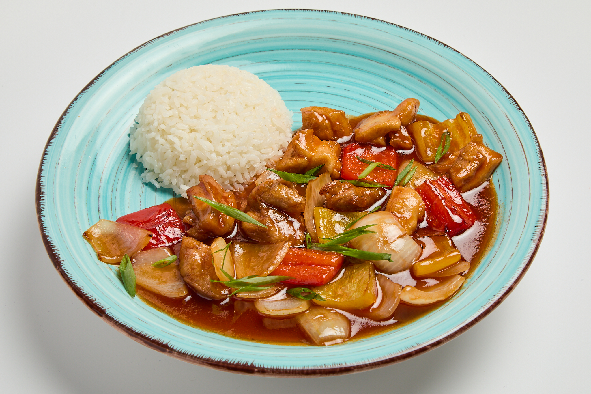 Куриные окорочка,болгарский перец,лук,масло кунжутное,рис,соус кисло-сладкий.