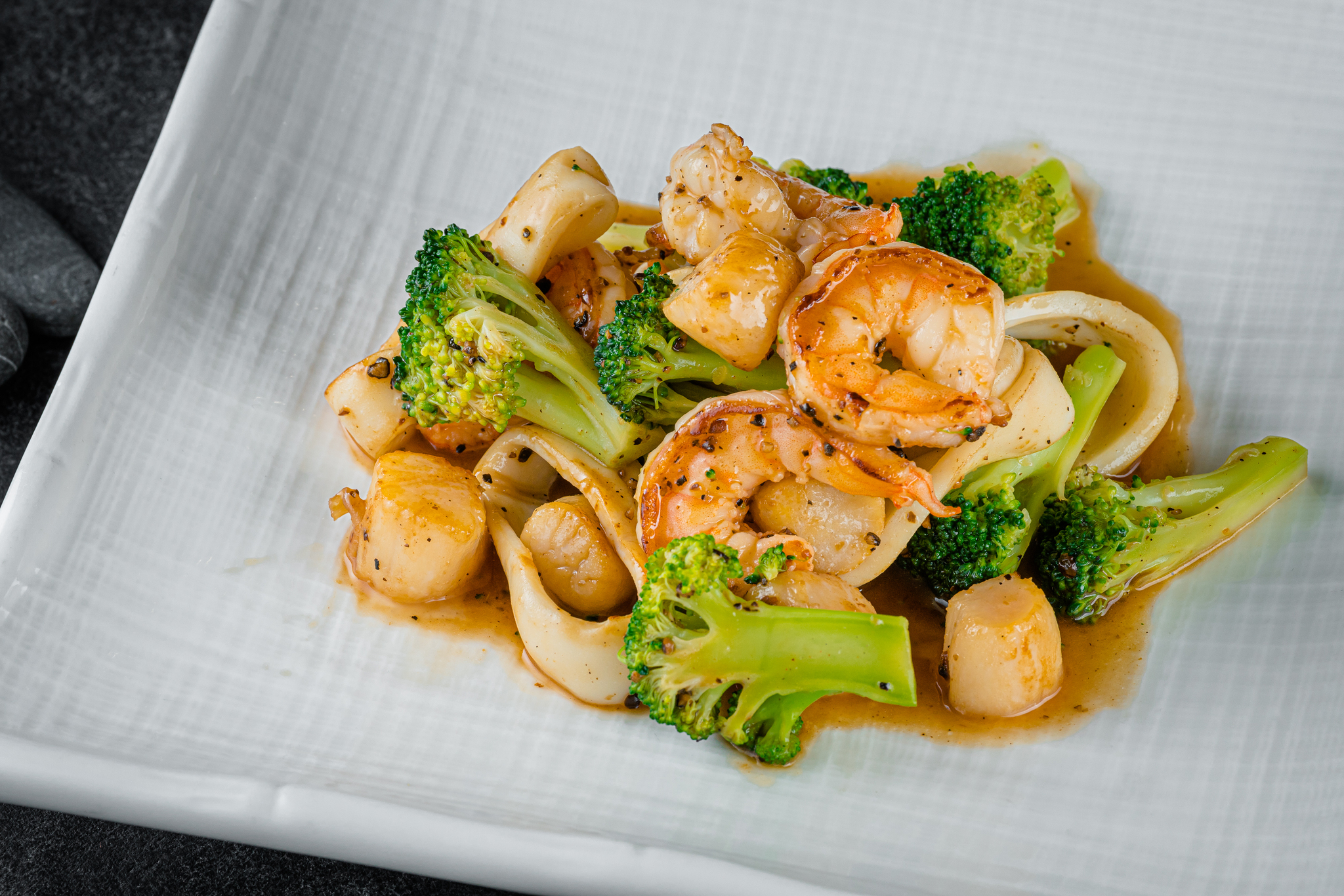 Соус черный перец ,гребешок ,креветки, кальмар ,саке,масло кунжутное ,кунжут,брокколи.