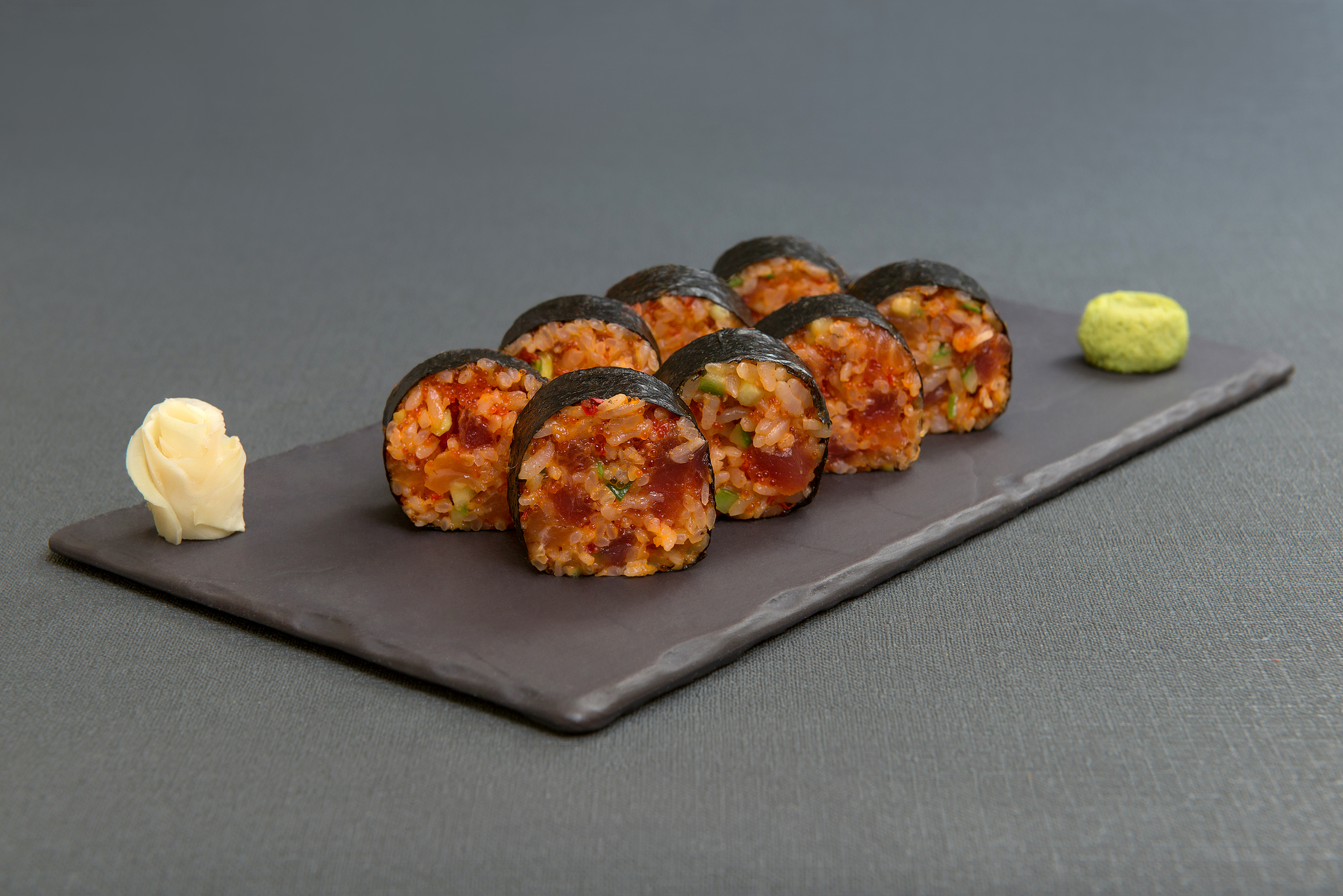 огурец, лосось свежий, тунец свежий, икра тобико, соус острый кимчи, майонез, рис отварной с заправкой, водоросли нори, имбирь, васаби, соевый соус.