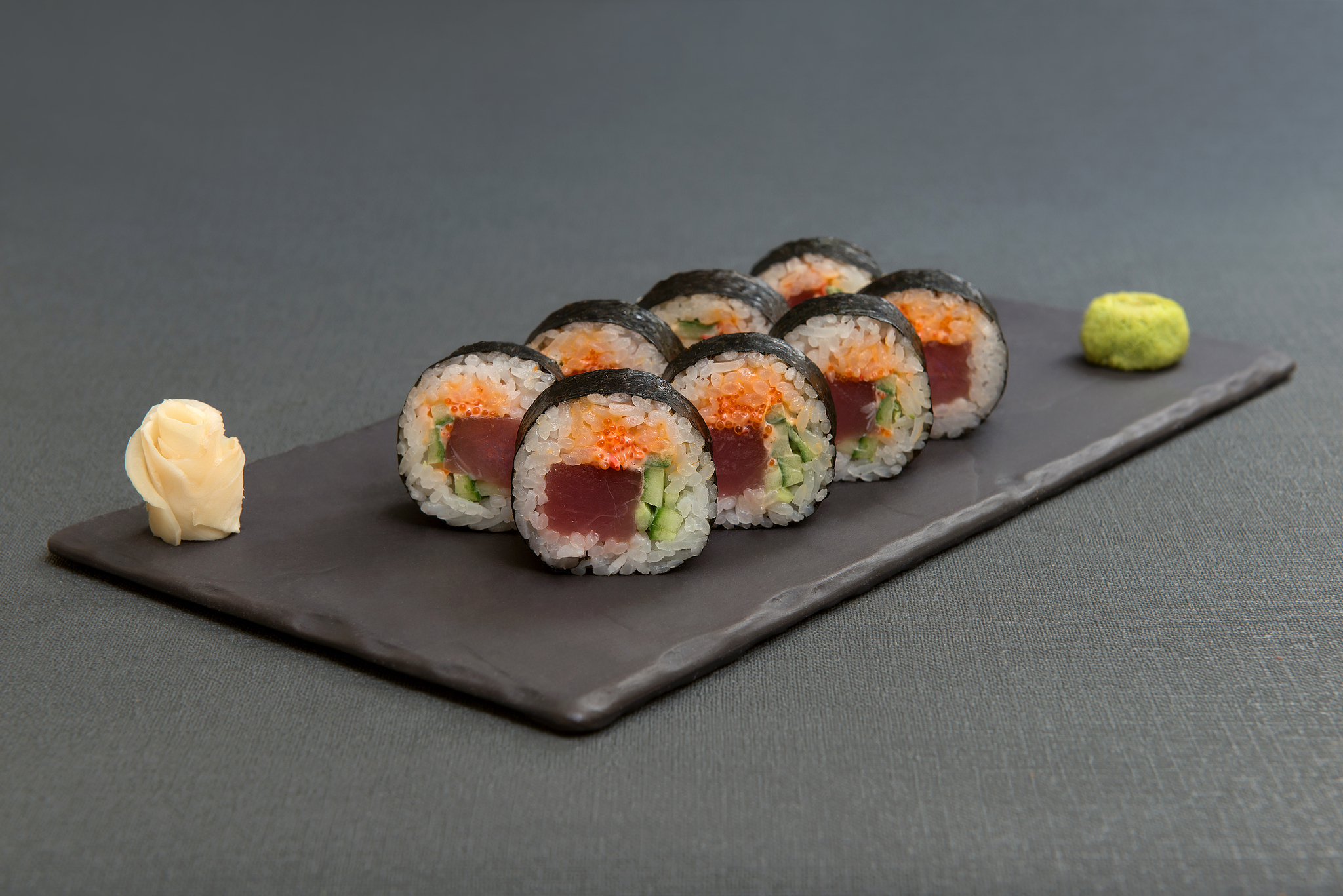 огурец, тунец свежий, икра тобико, соус острый кимчи, майонез, имбирь тертый, рис отварной с заправкой, водоросли нори, имбирь, васаби, соевый соус.