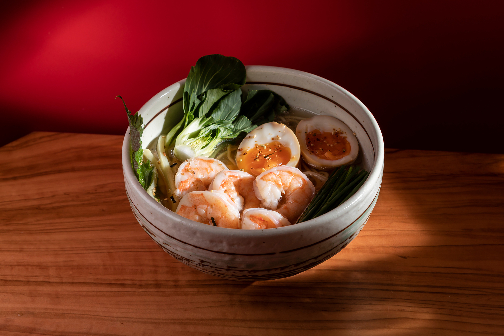 Креветки,креветочный бульон , Лапша Соба, салат микс Токио,Бамбук маринованный,грибы еноки, яйцо маринованное,нори, лук сибулет.
