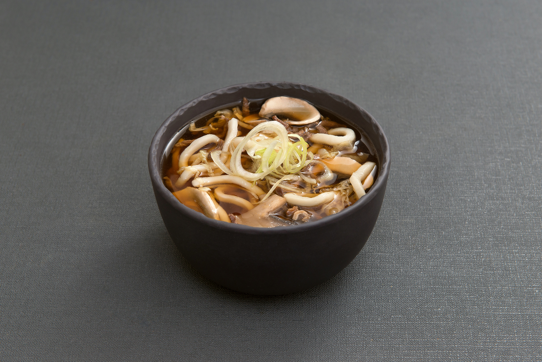 суп с говядиной, лапшой удон, китайской капустой, шампиньонами, чесноком, имбирем, луком порей