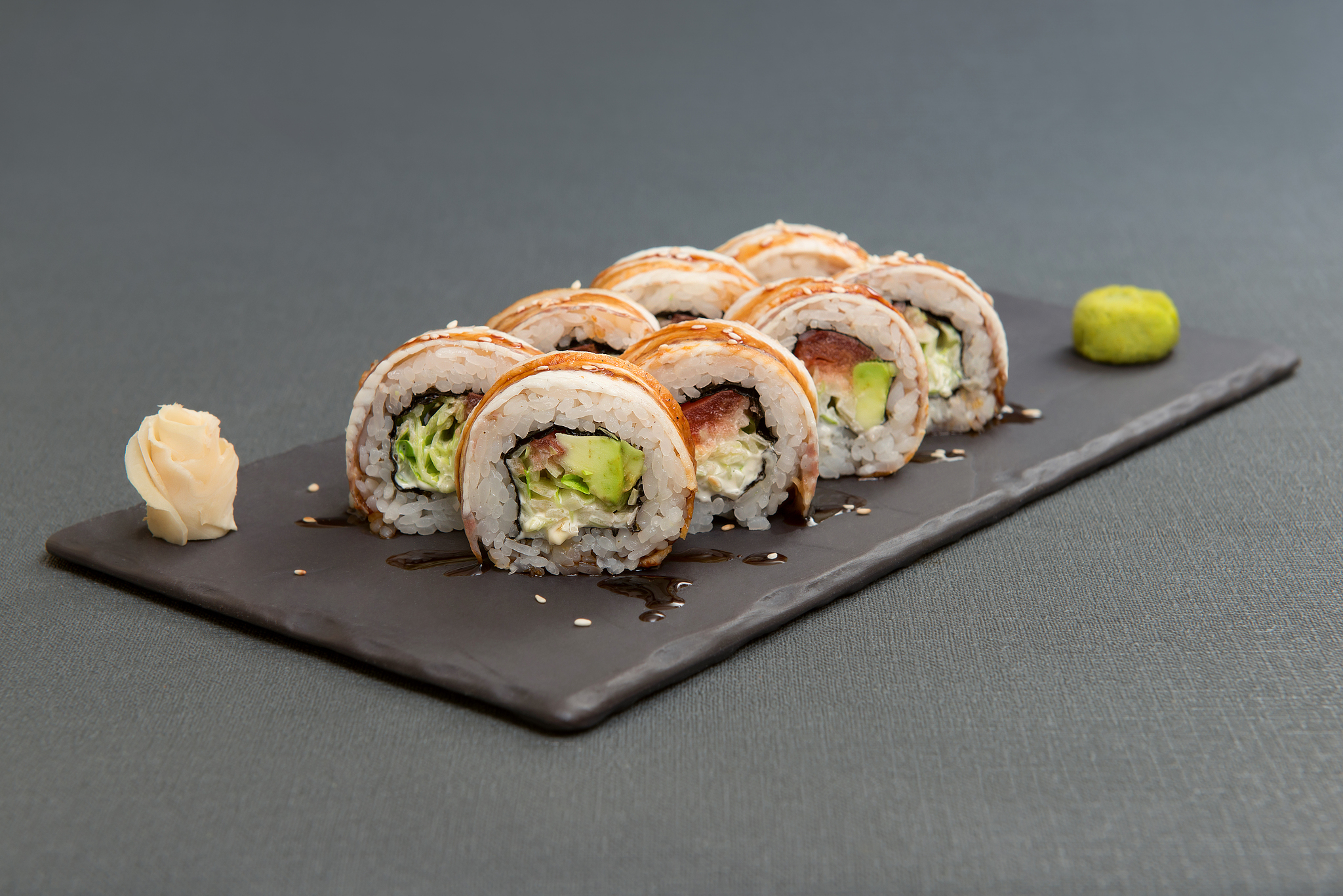 угорь копченый, салат айсберг, помидор, авокадо, майонез, семя кунжута, соус терияки,  рис отварной с заправкой, водоросли нори, имбирь, васаби, соевый соус.