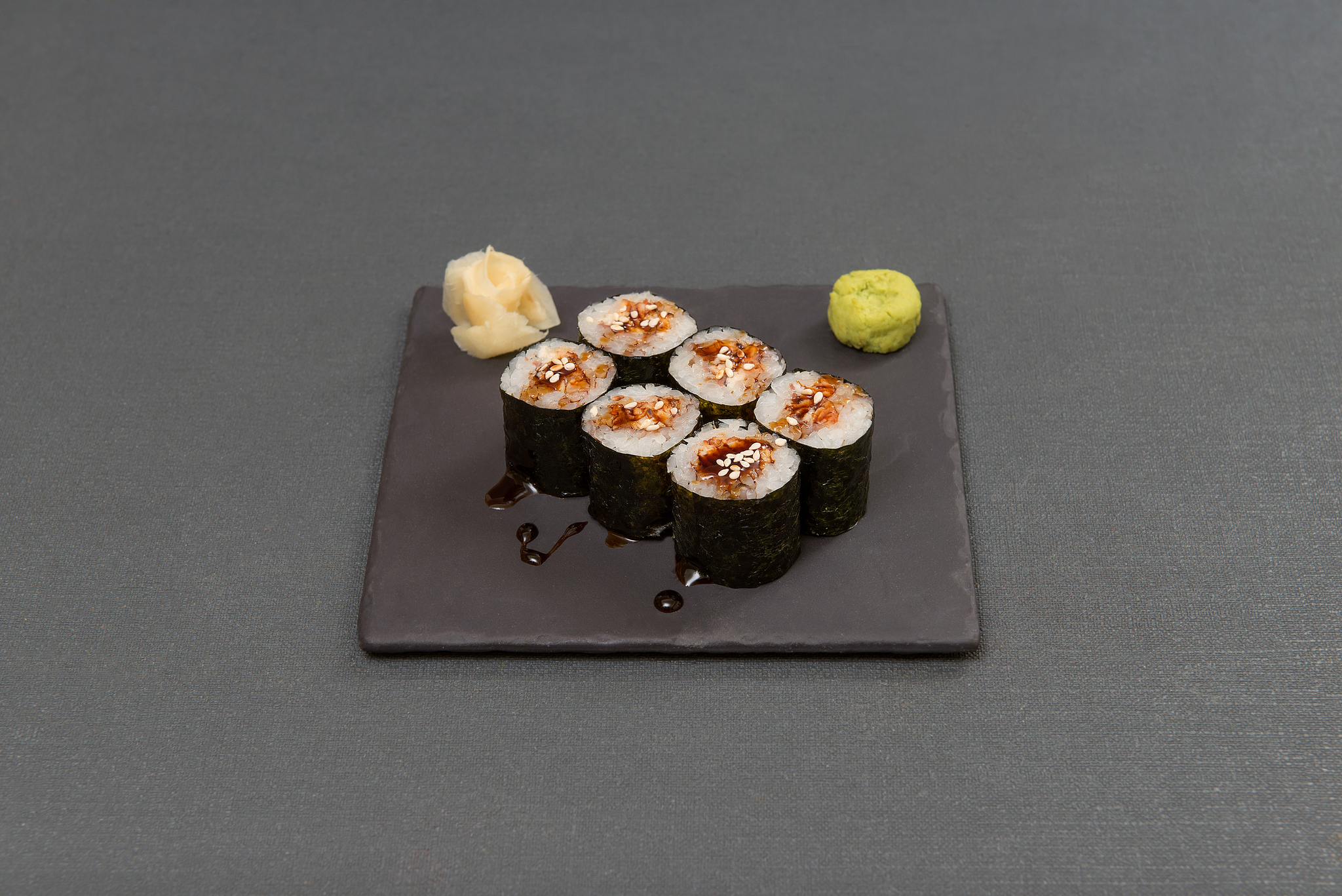 копченый угорь, семя кунжута, соус терияки, рис отварной с заправкой, водоросли нори, имбирь, васаби, соевый соус.