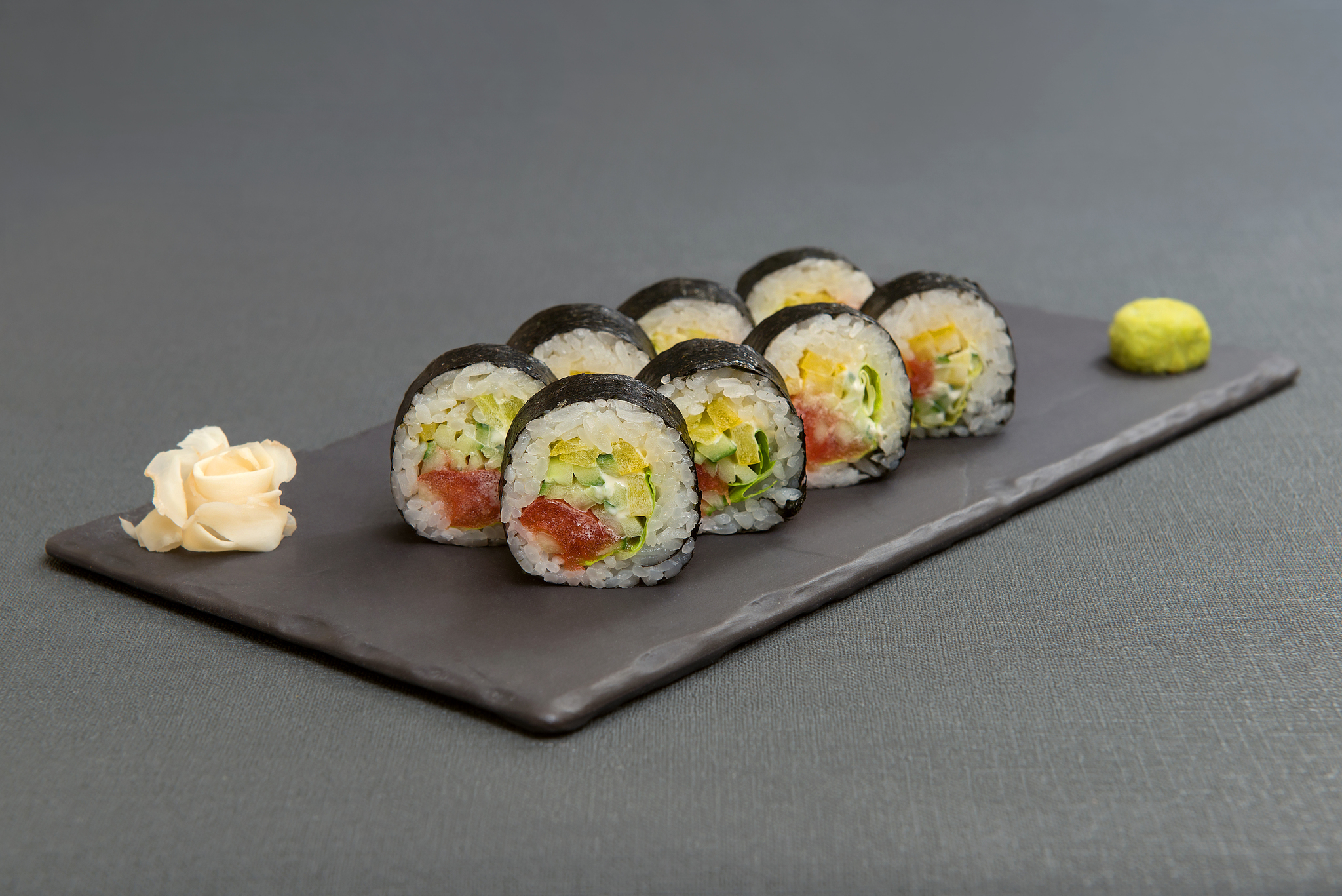 помидор, салат романо, перец болгарский, огурец, майонез, рис отварной с заправкой, водоросли нори, имбирь, васаби, соевый соус.